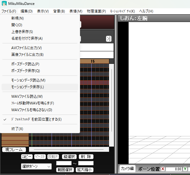 そしたら左上のファイルを選択するとモーションデータ読込がありますそこをクリック